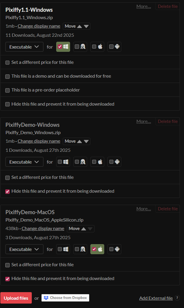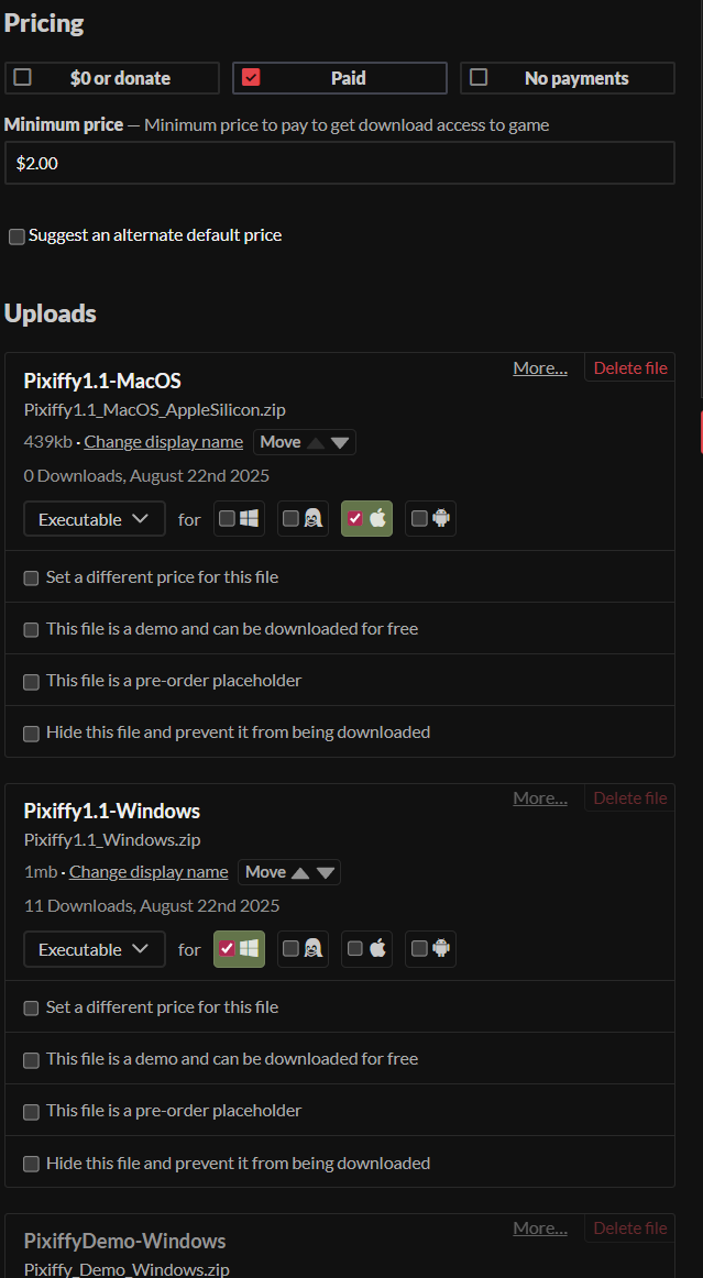 Did you configure the files or pricing tiers in a particular way (separate download buttons, grouping by OS, etc.)?